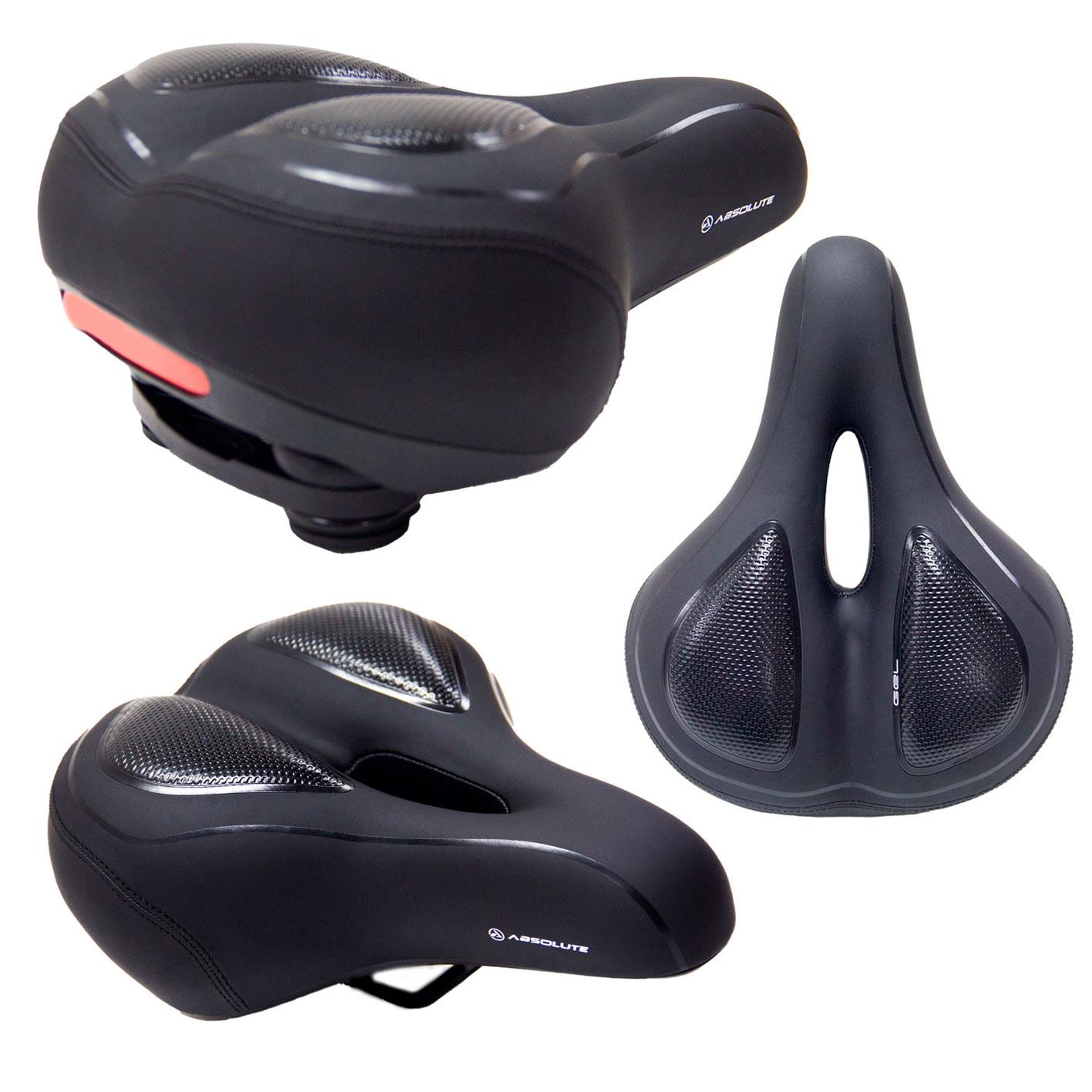 Selim Absolute Comfort reflective Preto/Preto, Vazado, c/ refletivo traseiro, Trilhos Em Aço C/ Apliques Em Gel Molas De Elastômero